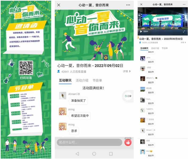 此次草坪音樂節(jié)采取線上直播+互動(dòng)的形式舉辦,不僅邀請(qǐng)了麥靠北樂隊(duì)和三陳樂隊(duì)現(xiàn)場(chǎng)助興,唱響了14支優(yōu)美曲子,還穿插了抽獎(jiǎng)環(huán)節(jié),開發(fā)區(qū)人才交流群也在同步互動(dòng),吸引了區(qū)內(nèi)來自星昊藥業(yè)、金城金素、利誠檢測(cè)、康天晟合、艾一生科、金馬游樂、明陽智能、中鐵裝備集團(tuán)、藍(lán)軒氫能科技等企業(yè)上百名人才參加、超過4.2萬名觀眾觀看了直播。此次活動(dòng)還得到了商家禮遇中山和有戲世界沉浸式互動(dòng)影城的抽獎(jiǎng)禮品的贊助。